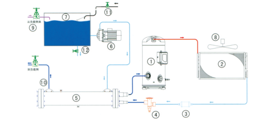 1、壓縮機 2、翅片式冷凝器 3、干燥過濾器 4、熱力膨脹閥 5、干式蒸發器 6、不銹鋼水泵