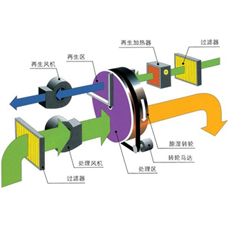 當處理空氣通過轉輪的處理區域時,其中的水蒸汽被轉輪中的吸濕介質所吸附,水蒸氣同時發生相變,變為液態水,并釋放出潛熱;這時,處理空氣因自身的水份減少而變成干空氣;之后,處理空氣由處理風機送出,變成干的、熱的空氣。